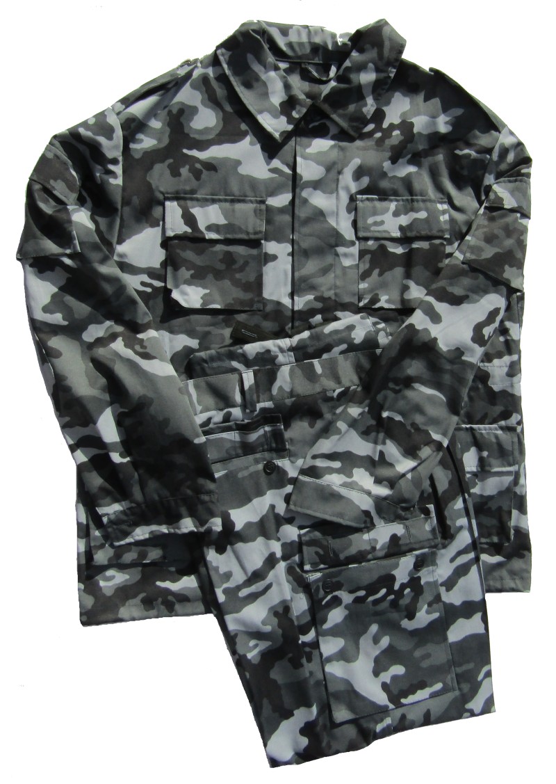 camouflage set.Long sleeve shirt has 2 upper pockets and 1 sleeve