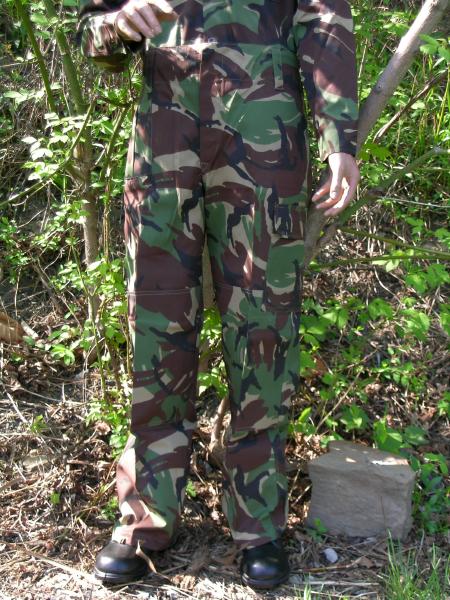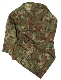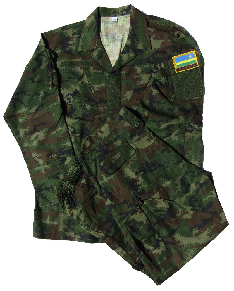 | RDF1.Rwanda camouflage uniform. Pants have 2 front pockets,2 cargo pockets, 2 lower leg pockets, 2 back pockets,elastic ankles. Jacket has 2 upper slant pockets, 2 lower pockets, 2 sleeve pockets $119.95 |