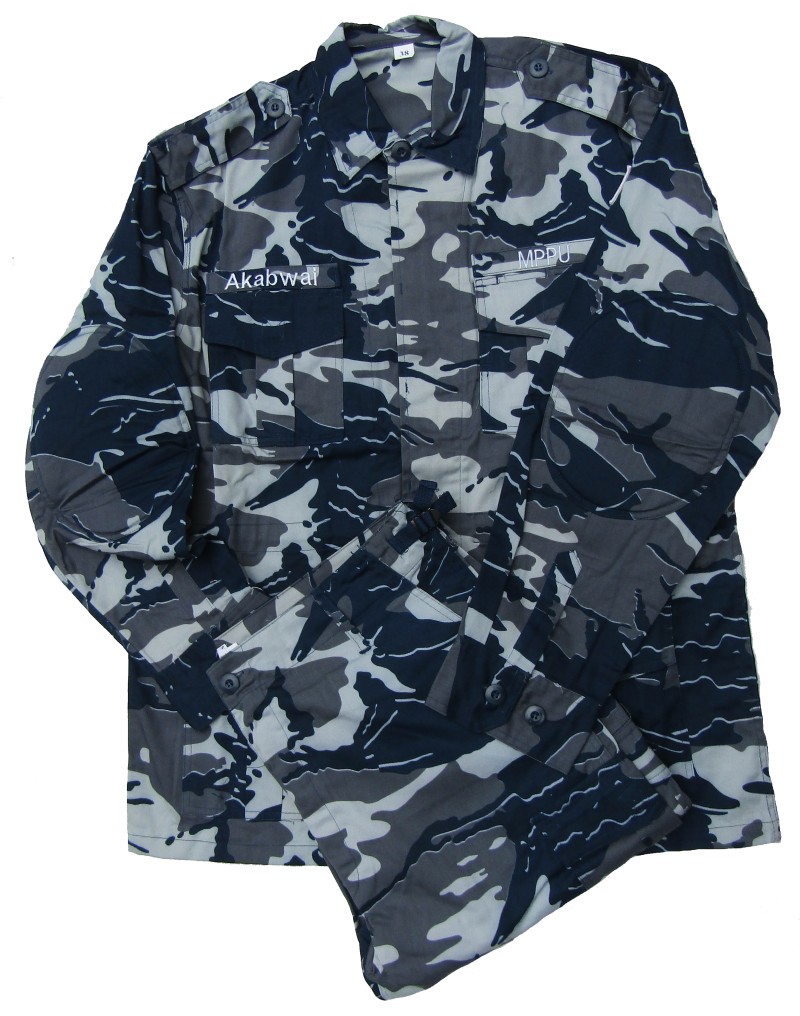 | UGANDA1.Ugandan Blue camouflage set, jacket and pants. Jacket is 4 pocket with padded elbows and flag sleeve patch, MPPU patch and name tag. Pants are 6 pocket with padded knees $119.95 |