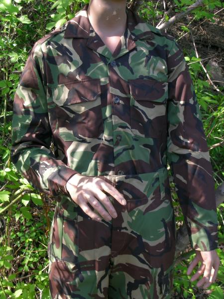 | MOR1.Moroccan Army camouflage set, jacket and pants. Jacket is zip up with button front, 2 upper and 2 lower pockets with snap closure. Pants have 2 front pockets, 2 back pockets, 2 cargo pockets, all with snap closure. Jacket size 56M, Pants size 45M.Unissued. $199.95 |